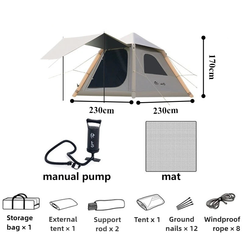 A durable and portable inflatable tent designed for outdoor camping. With quick automatic setup, rainproof protection, and thickened fabric, it offers comfort and stability for family overnight stays.