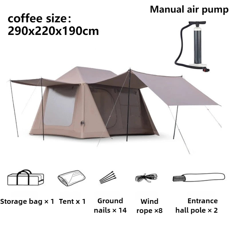 A spacious and durable inflatable tent designed for outdoor camping. With quick automatic setup, sunshade protection, and rainproof materials, it provides a reliable shelter for family or group adventures.