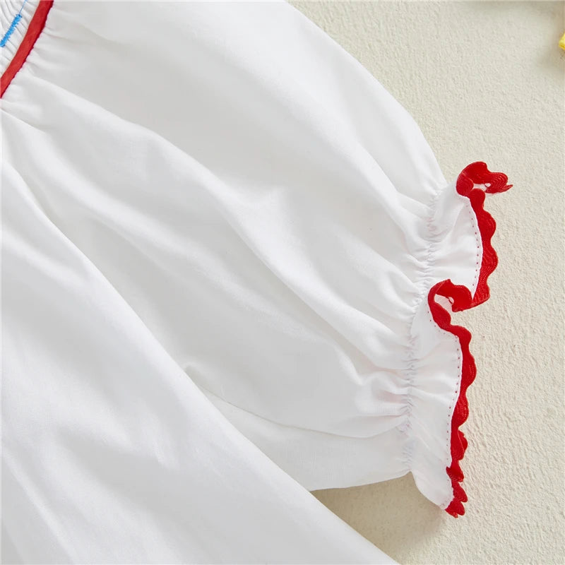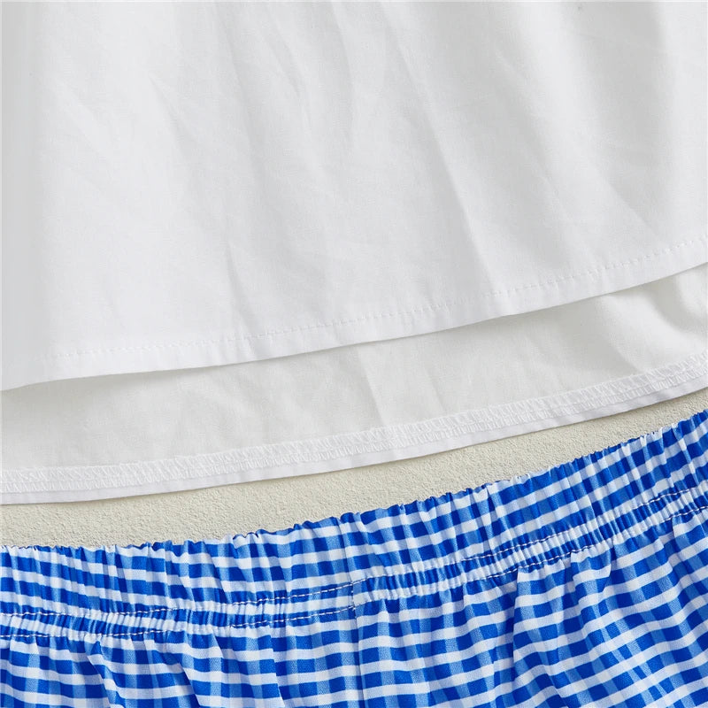 Dress your little one in this sweet 2-piece summer outfit. Featuring a smocked short-sleeve top with apple embroidery and matching plaid shorts, it’s the perfect blend of comfort and style for everyday play or outings.