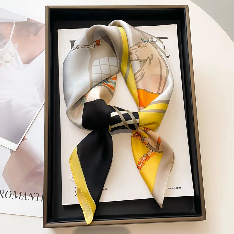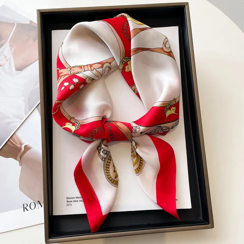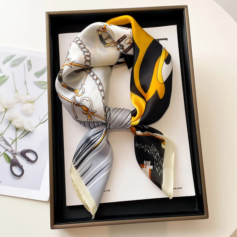 Stylish and versatile silk-feel square scarf designed for women. Made from soft polyester with a smooth satin finish, perfect for wearing as a neck tie, hair accessory, or office wrap. Adds a refined touch to both casual and formal outfits throughout all seasons.