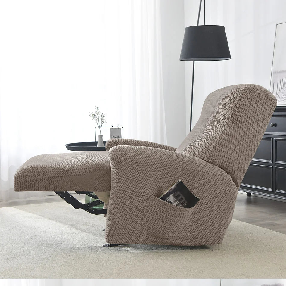 Protect and refresh your recliner chair with this jacquard slipcover. Made from soft and durable polyester-spandex fabric with a jacquard knitting pattern, it provides a snug fit while safeguarding your chair from daily wear, pet scratches, and accidental stains. Designed for easy installation and all-around coverage, this cover is both practical and stylish for spring and summer living spaces.