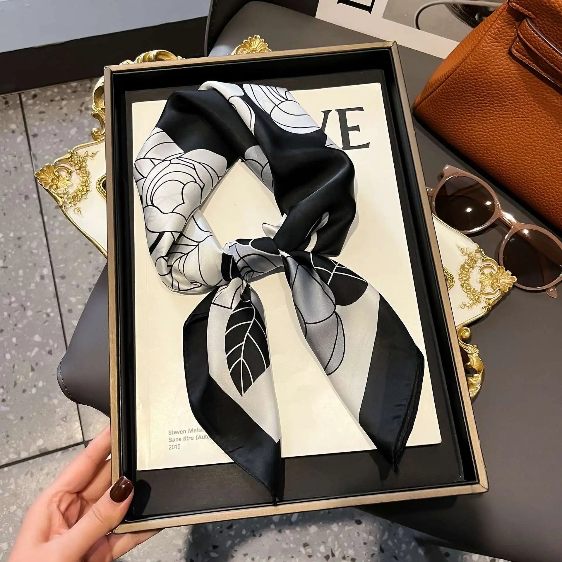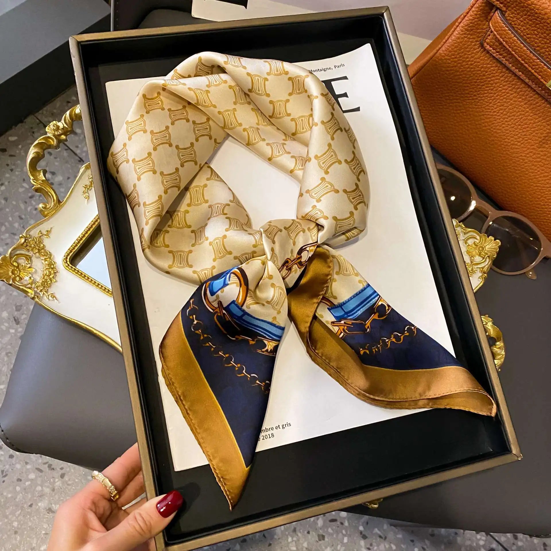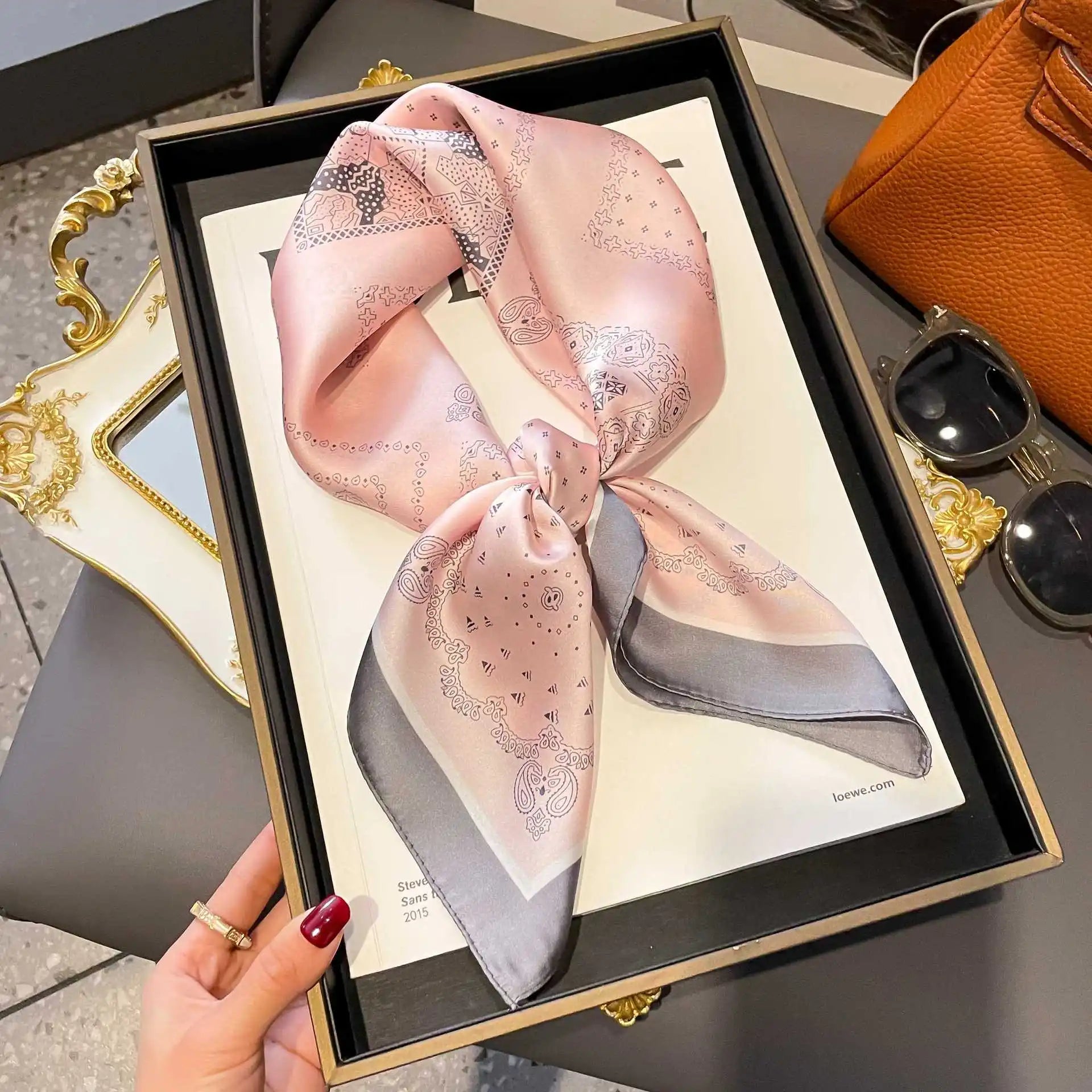 Stylish and soft silk plaid scarf designed for modern women. This versatile square scarf can be worn as a hijab, neck scarf, or hair tie, adding a touch of elegance to both casual and work outfits. Lightweight and breathable for all-season comfort.