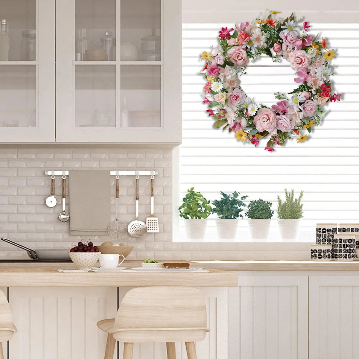 Floral Design: Features an arrangement of realistic artificial flowers in bright spring and summer hues, creating a cheerful and inviting look for your front door, wall, or entryway decor.