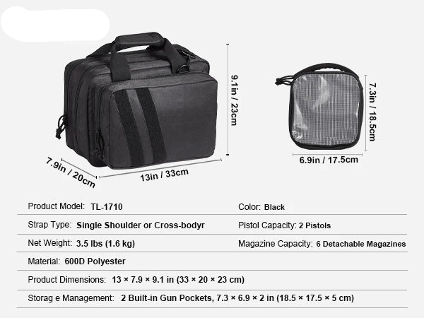 - Small model: 33 × 20 × 23 cm (13 × 7.9 × 9.1 in) — fits up to 2 pistols and 6 magazines — approximate packed dimensions and specs as shown above