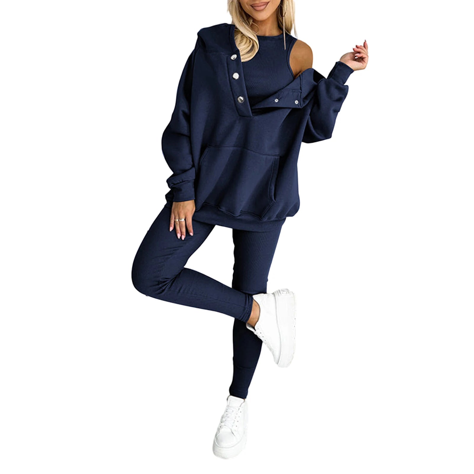 Stay comfortable and stylish with this casual 2-piece sweatshirt and joggers set. Designed with a long-sleeve hooded sweatshirt featuring a button collar and front pocket, paired with high-waisted jogging pants, it’s perfect for spring, autumn, and winter. Soft, cotton-blend fabric ensures all-day comfort, while the solid color and versatile design make it easy to mix and match for everyday wear. Ideal for lounging at home, running errands, or casual outings.